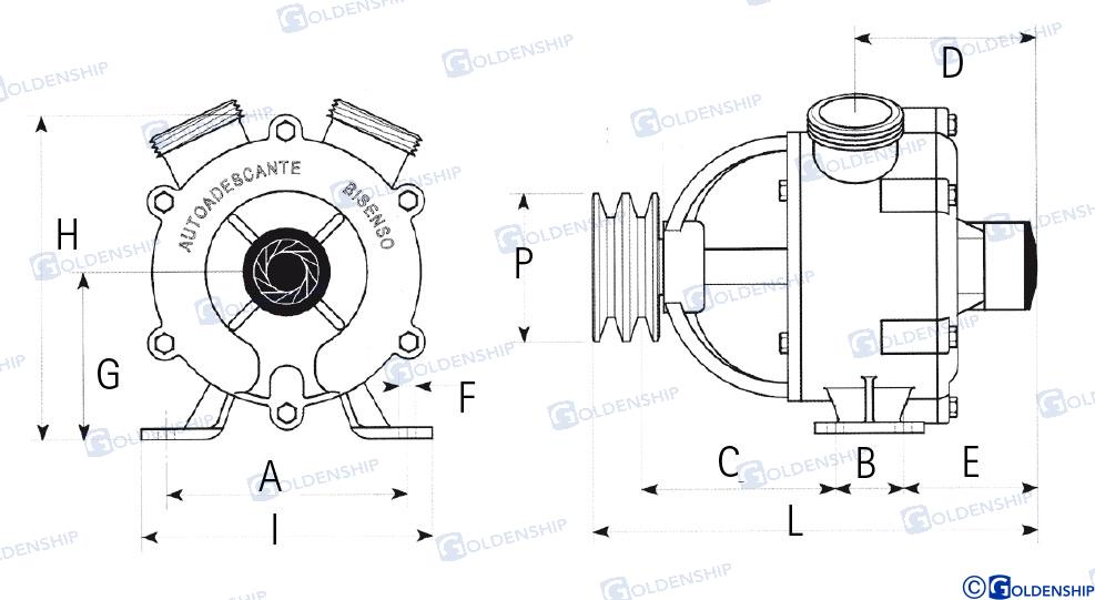 Bronze pump and aisi 316 stainless steel shaft. Used to transfer liquids free of solid impurities such as fresh water, seawater, diesel and oils. Reversible and self-priming up to 6 m.